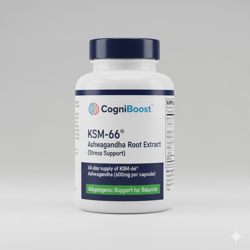 Ashwagandha (Withania somnifera) is an adaptogenic herb used traditionally to help the body manage stress. This product uses the patented **KSM-66®** extract, clinically studied for its potential to help reduce temporary stress and promote a sense of calmness.