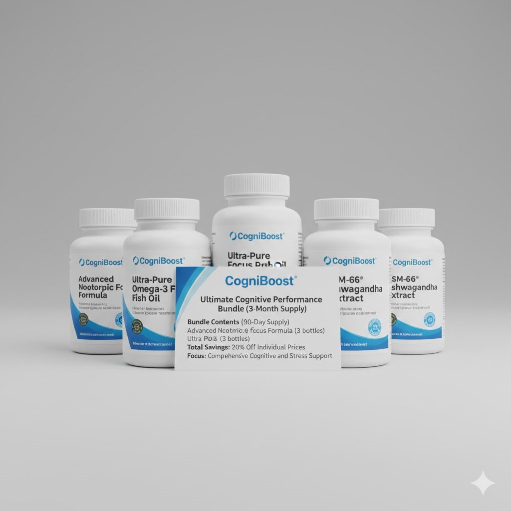 Ultimate 90-day bundle for cognitive performance, combining Nootropics, Omega-3s, and Ashwagandha for comprehensive mental support.