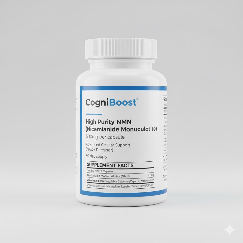 High-purity NMN (500mg per capsule) designed to support NAD+ levels, potentially aiding cellular energy and vitality (30-day supply).